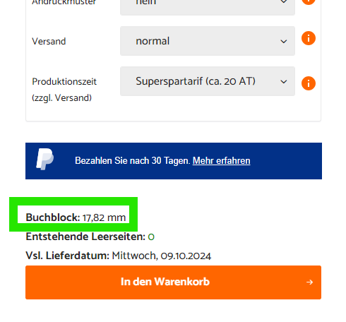 Der Konfigurator errechnet den Buchblock automatisch. Der Buchblock wird unterhalb des Konfigurators, ober halb des Buttons "In den Warenkorb" angezeigt.